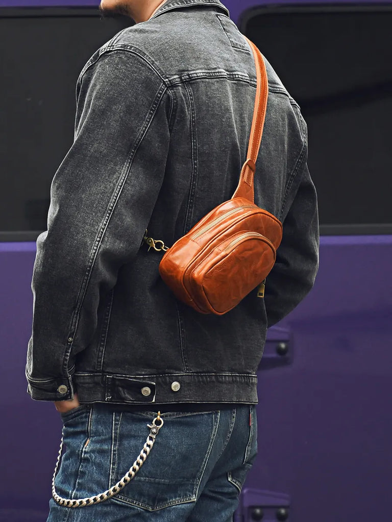 New Men's Crossbody Top Cowhide Casual Chest Backpack Genuine Leather Fashion Commuter Chest Bag Cell Phone Bag Β· Brown